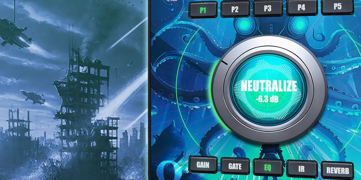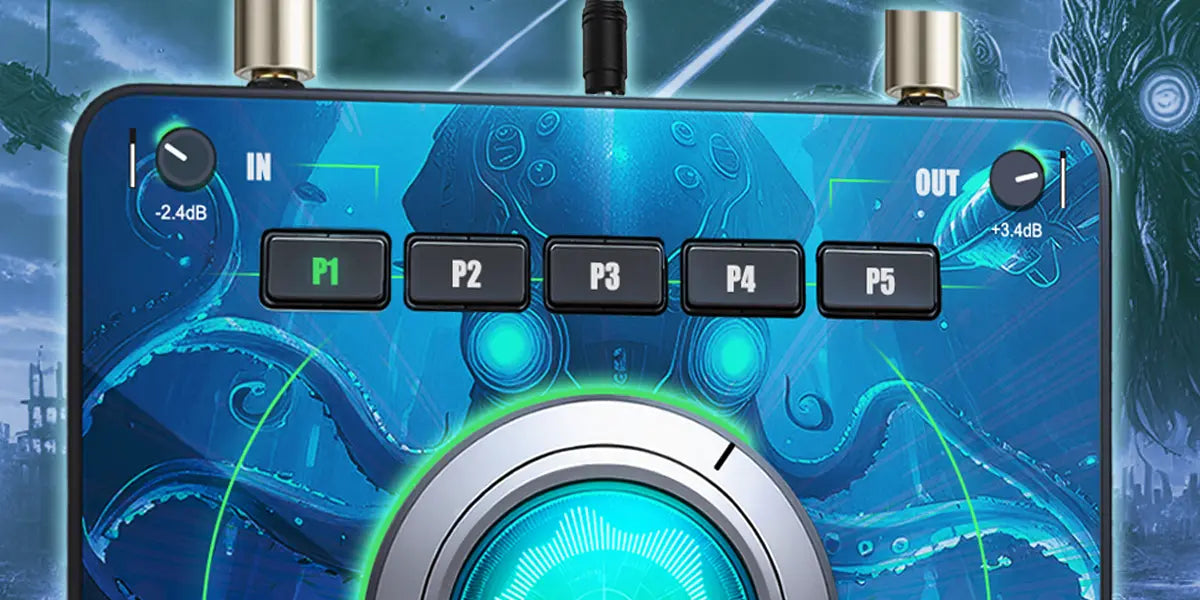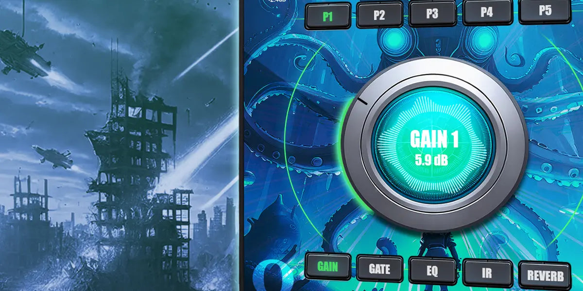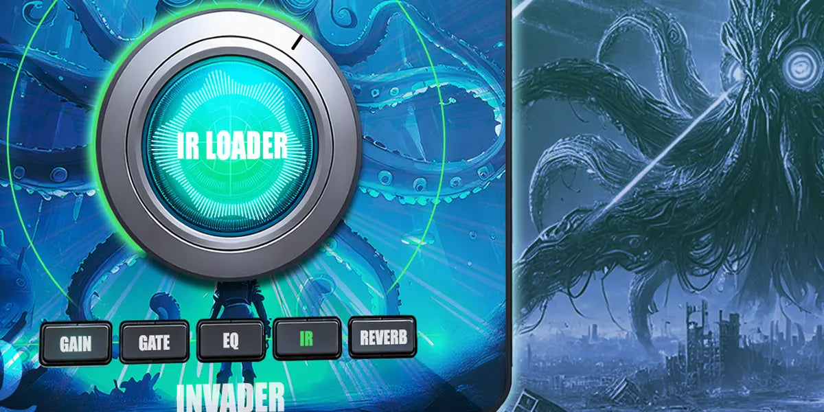 Sent by a force of pure guitar tone known as the Q, a squid-like figure descended from beyond, draped in a cloak of shadows and ominous glowing lights. The creature was holding a device – an amplifier - unlike any the world had known. It was The Invader, a sleek, ominous sonic weapon that pulsed with a fierce, otherworldly energy. As the figure connected its guitar to The Invader, an immense, searing tone shattered the silence, sending waves of raw sound through every corner of the planet. Time seemed to slow to a halt as glorious tones permeated every dried and broken crack. It was the sound of a new beginning, It was heavy, grinding, alive with both clarity and distortion—a tone that defied resistance.